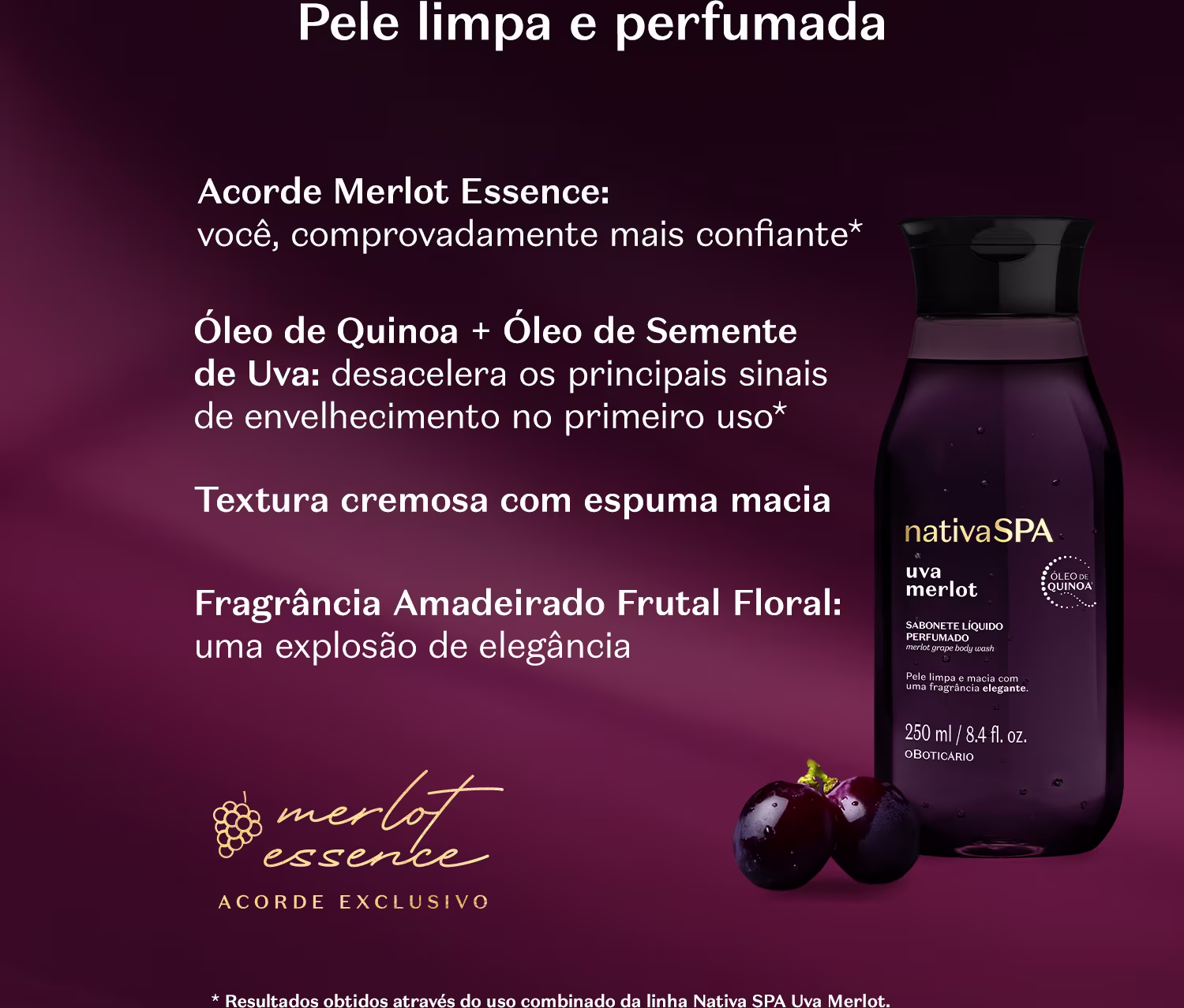 Sabonete Líquido Perfumado Nativa Spa o Boticário Uva Merlot: Sinta a experiência de um banho sedutor, perfumado e luxuoso, recuperando um tempo que sempre foi seu. Ver mais ❯