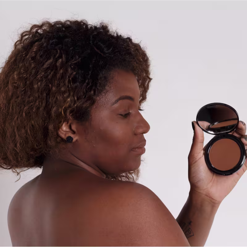 Pó compacto. Negra Rosa promove uma pele uniforme, com aspecto aveludado e sem ressecar.
