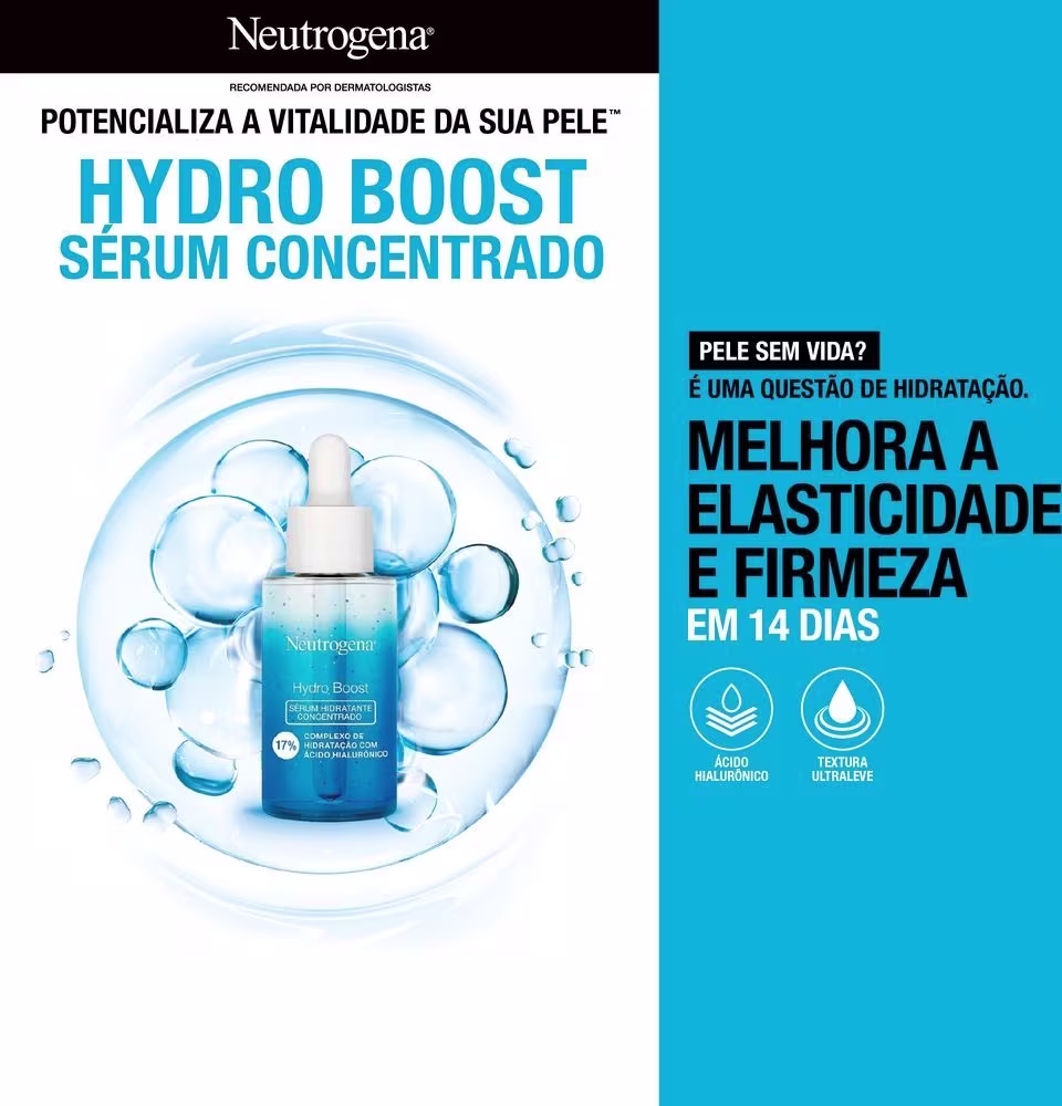 O Sérum Hidratante Neutrogena Hydro Boost combina dois tamanhos de Ácido Hialurônico e Glicerina que penetram 9 camadas superficiais da pele. Combate até 100% do ressecamento facial com seu complexo de hidratação com 17% de Ácido Hialurônico.