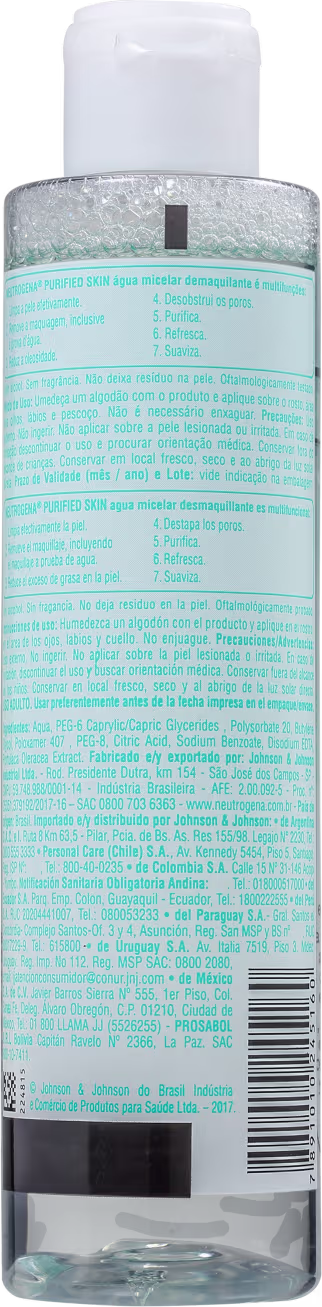 Água micelar para peles mistas e oleosas. Neutrogena Purified Skin possui fórmula com 7 benefícios para o cuidado diário: limpa, purifica, demaquila, controla a oleosidade, desobstrui os poros, refresca e suaviza a pele.
