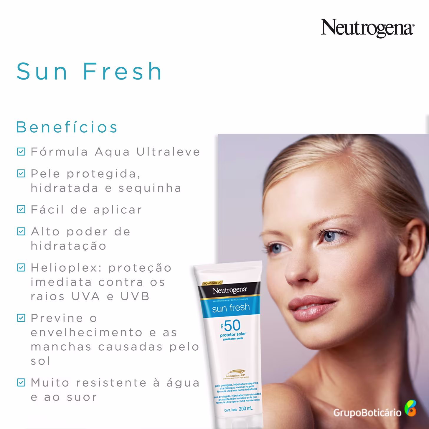 Protetor solar para todos os tipos de pele. À base de água, Neutrogena Sun Fresh Helioplex XP FPS 50 oferece proteção com textura ultraleve, sequinha e confortável, sem aumentar a oleosidade.
