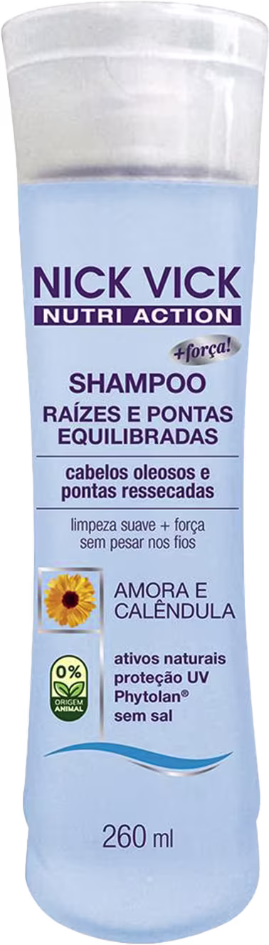 Nick & Vick NUTRI-Hair Raiz e Pontas Equilibradas proporciona sensação de limpeza duradoura sem ressecar o comprimento dos fios com sua função hidratante, que amacia e deixa as pontas suaves ao toque.