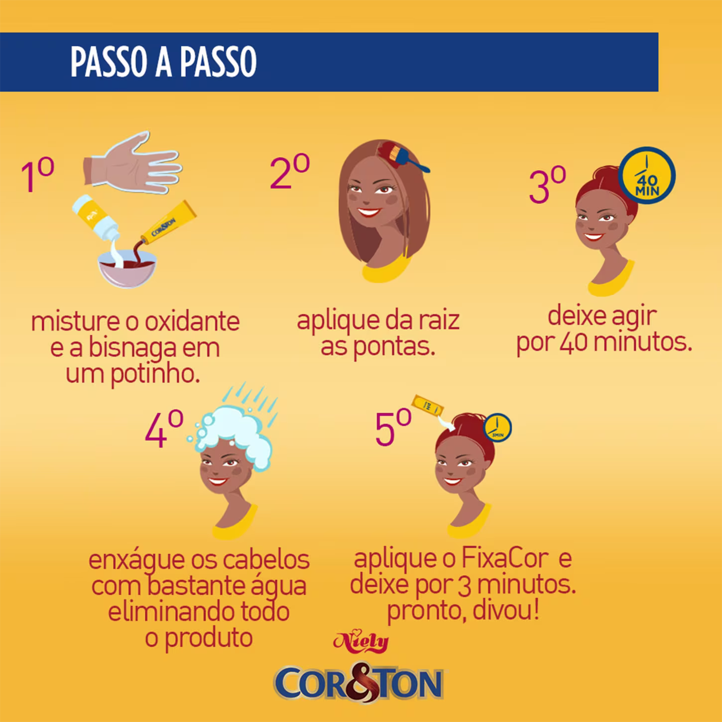 Coloração permanente em creme para todos os tipos de cabelo. Niely Cosméticos Cor & Ton garante cores vibrantes e duradouras da raiz às pontas, com cobertura uniforme em 100% dos fios brancos.