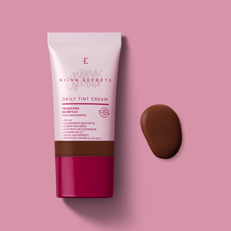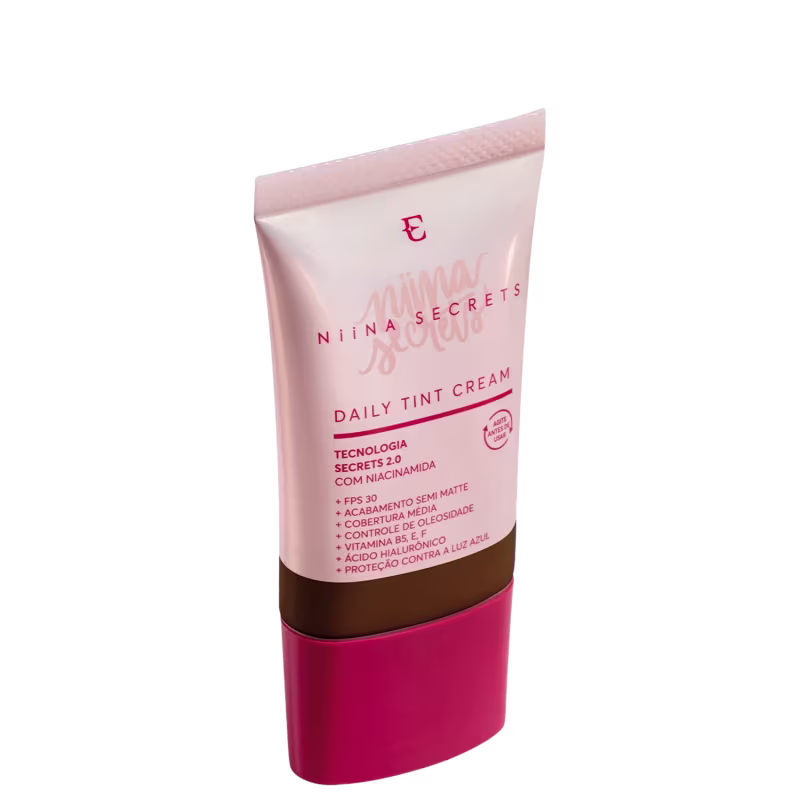 Base líquida. Niina Secrets Daily Tint Cream traz cobertura média, FPS 30, controle de oleosidade e hidratação para pele uniforme.