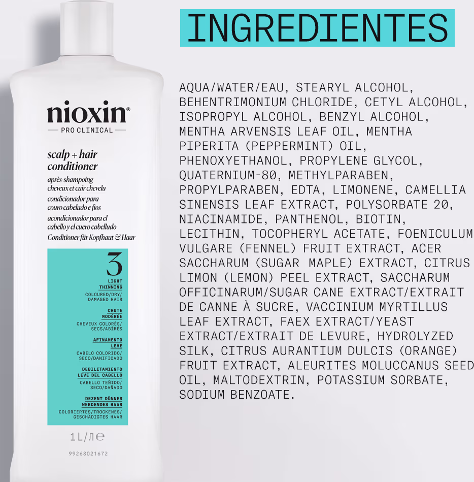 O Condicionador Nioxin Volume Thinning Sistema 3 é um tratamento hidratante e nutritivo para o couro cabeludo e cabelos. Trata-se de um produto formulado com uma combinação eficaz de Niacinamida, Biotina e Cafeína, ativos que nutrem profundamente a raiz do cabelo, estimulam os folículos capilares e fortalecem os fios.