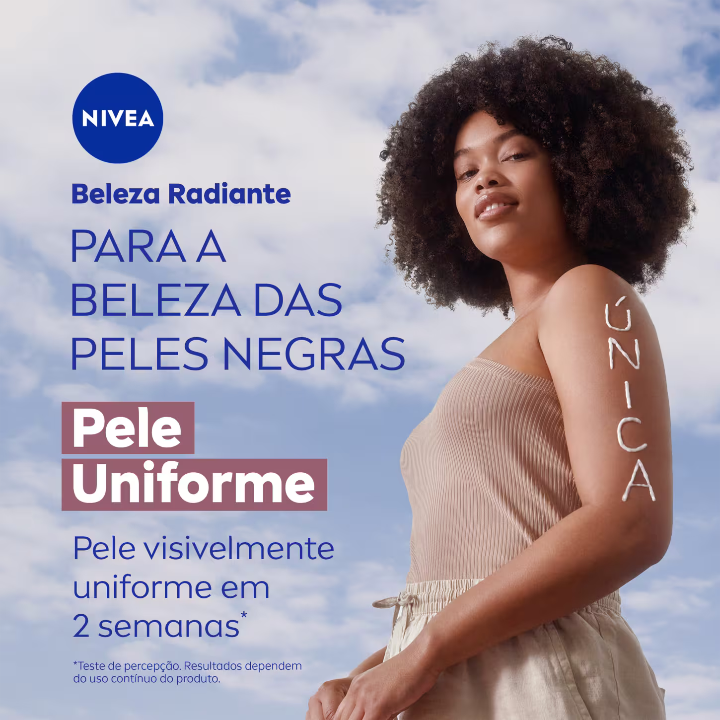 Hidratante corporal para peles secas. NIVEA Beleza Radiante Pele Uniforme desenvolvido especialmente para a beleza da pele negra, formulado com Vitamina C e Extrato de Pérolas.
