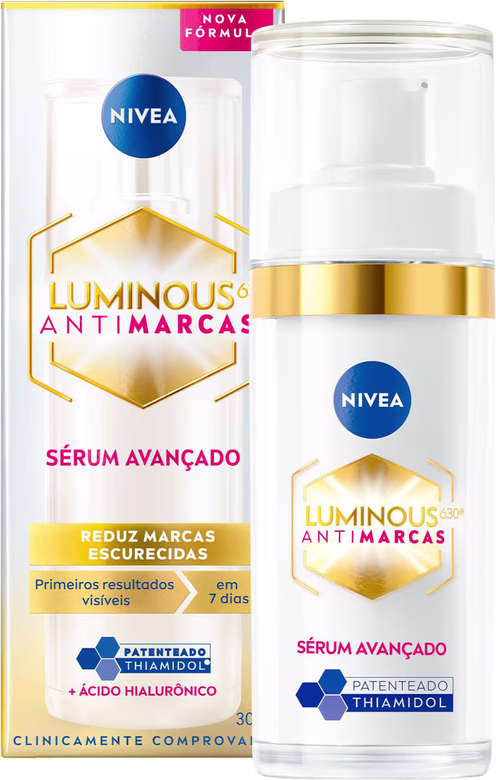 O Sérum NIVEA Cellular Luminous 630 Antispot conta com uma tecnologia exclusiva, enriquecida com Ácido Hialurônico e Vitamina E, que suaviza as marcas escuras existentes e evita o seu reaparecimento.