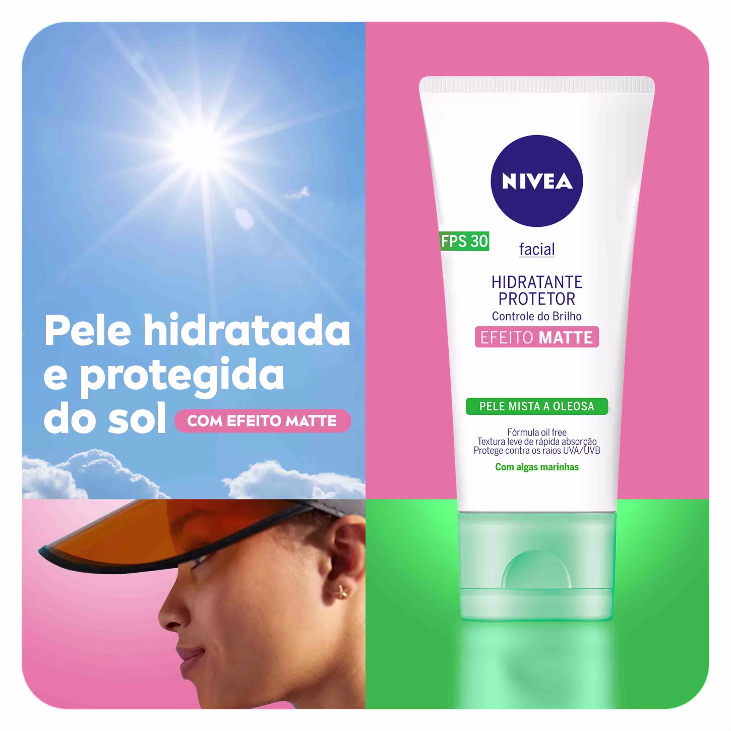 O Hidratante NIVEA Hidratante Protetor Controle do Brilho & Oleosidade é ideal para usar todos os dias. Possui FPS30 que garante proteção de amplo espectro e bloqueia os raios UVA e UVB, evitando sinais do envelhecimento precoce como melasmas. Além disso, é resistente à água, deixa um efeito matte e mantém o nível de umidade certo para que a derme esteja sempre bonita, com aspecto saudável e jovial.