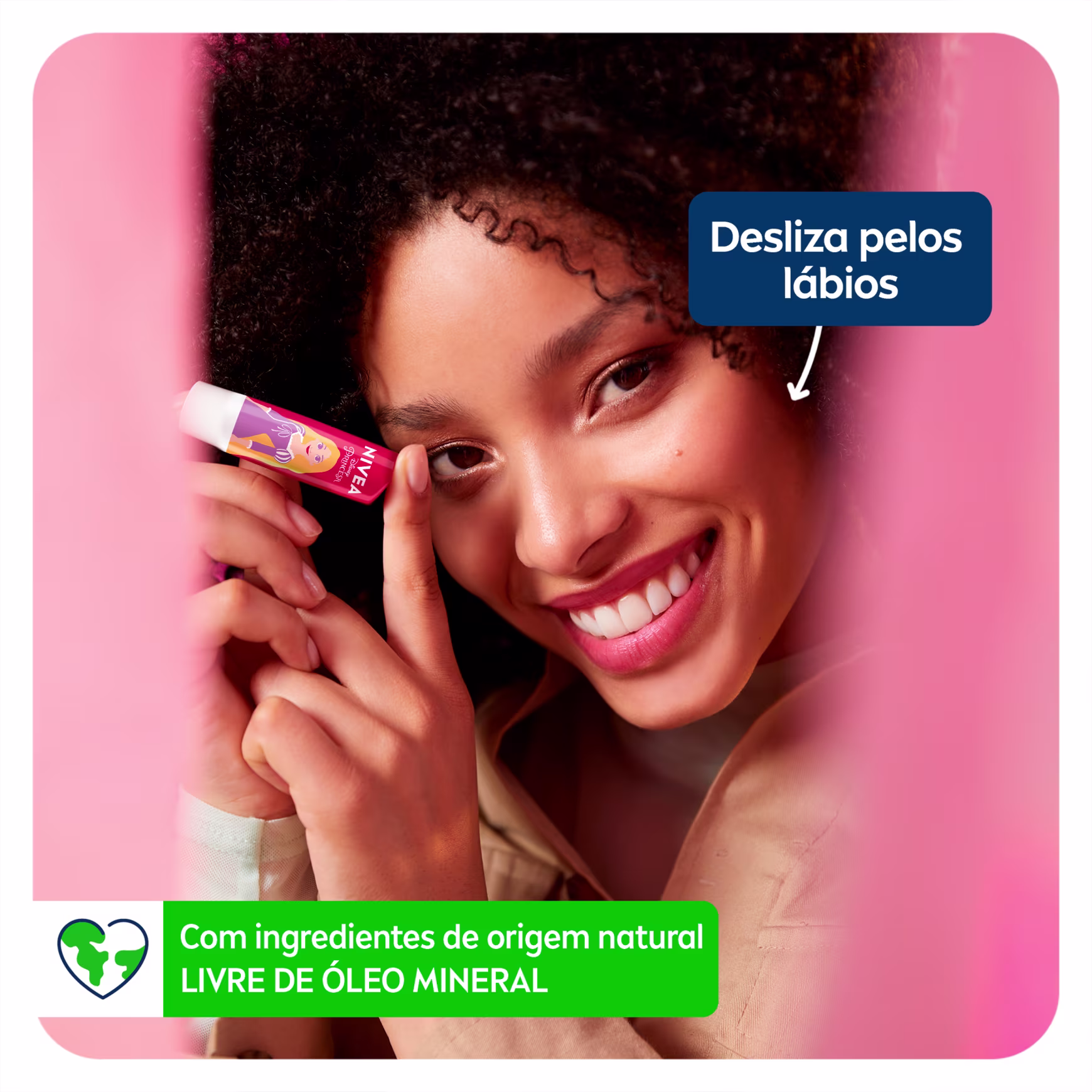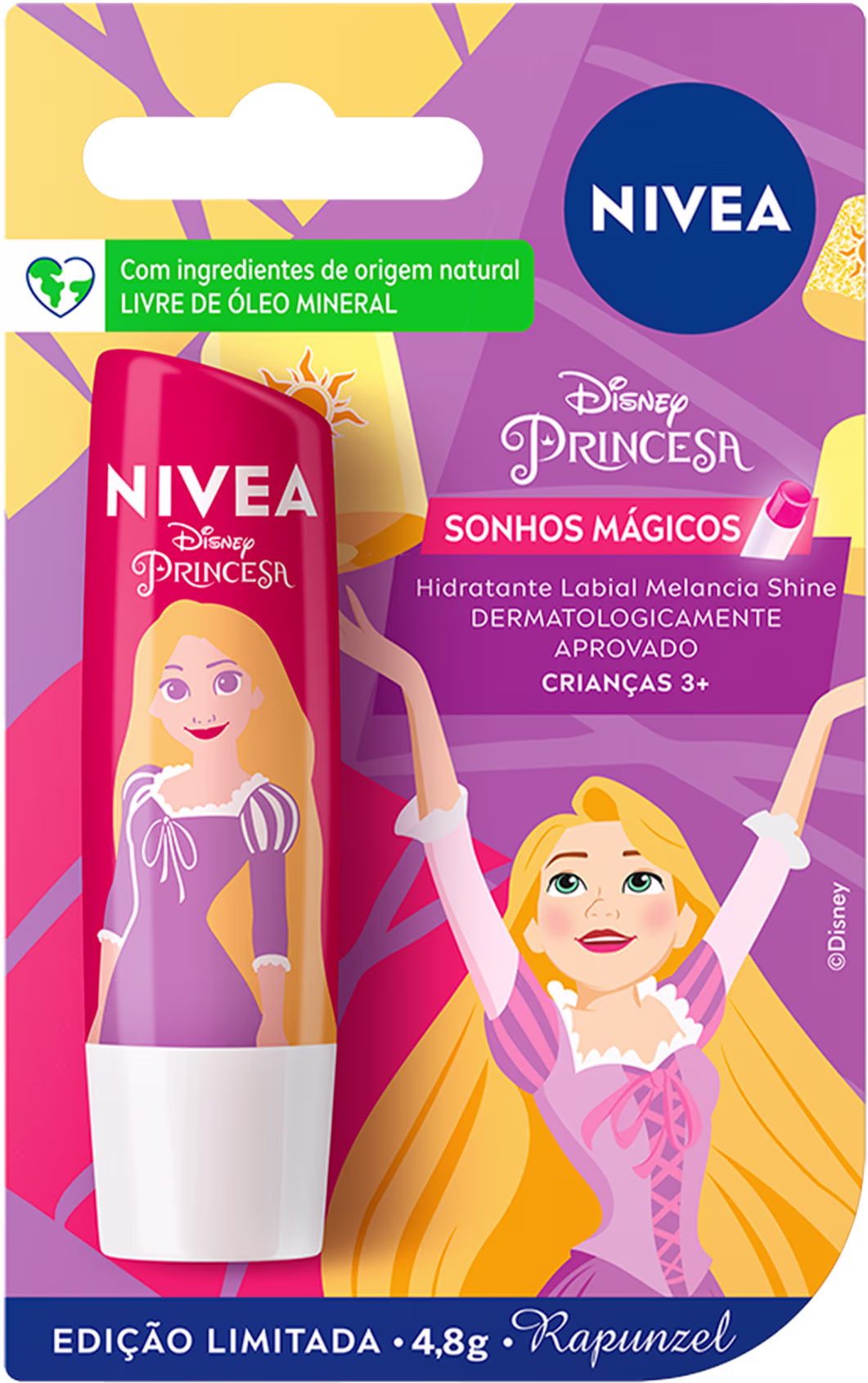 Hidratante labial. NIVEA Disney Rapunzel Melancia Shine protege contra o ressecamento dos lábios e hidrata por até 24h.