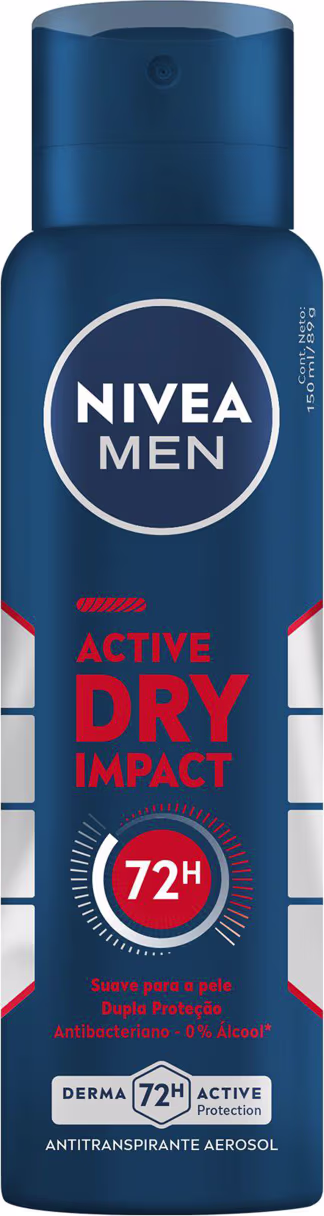 O Desodorante Antitranspirante Aerossol NIVEA Men Dry Impact conta com uma fórmula de dupla proteção, pois possui dois ativos antibacterianos, oferecendo uma defesa eficaz contra o suor e o mau odor.