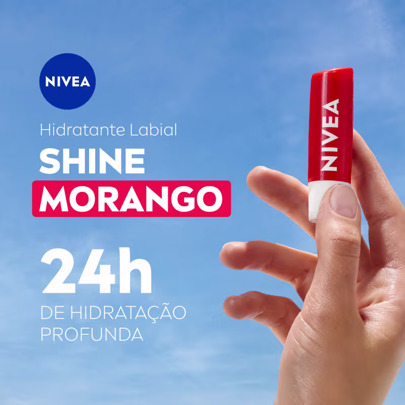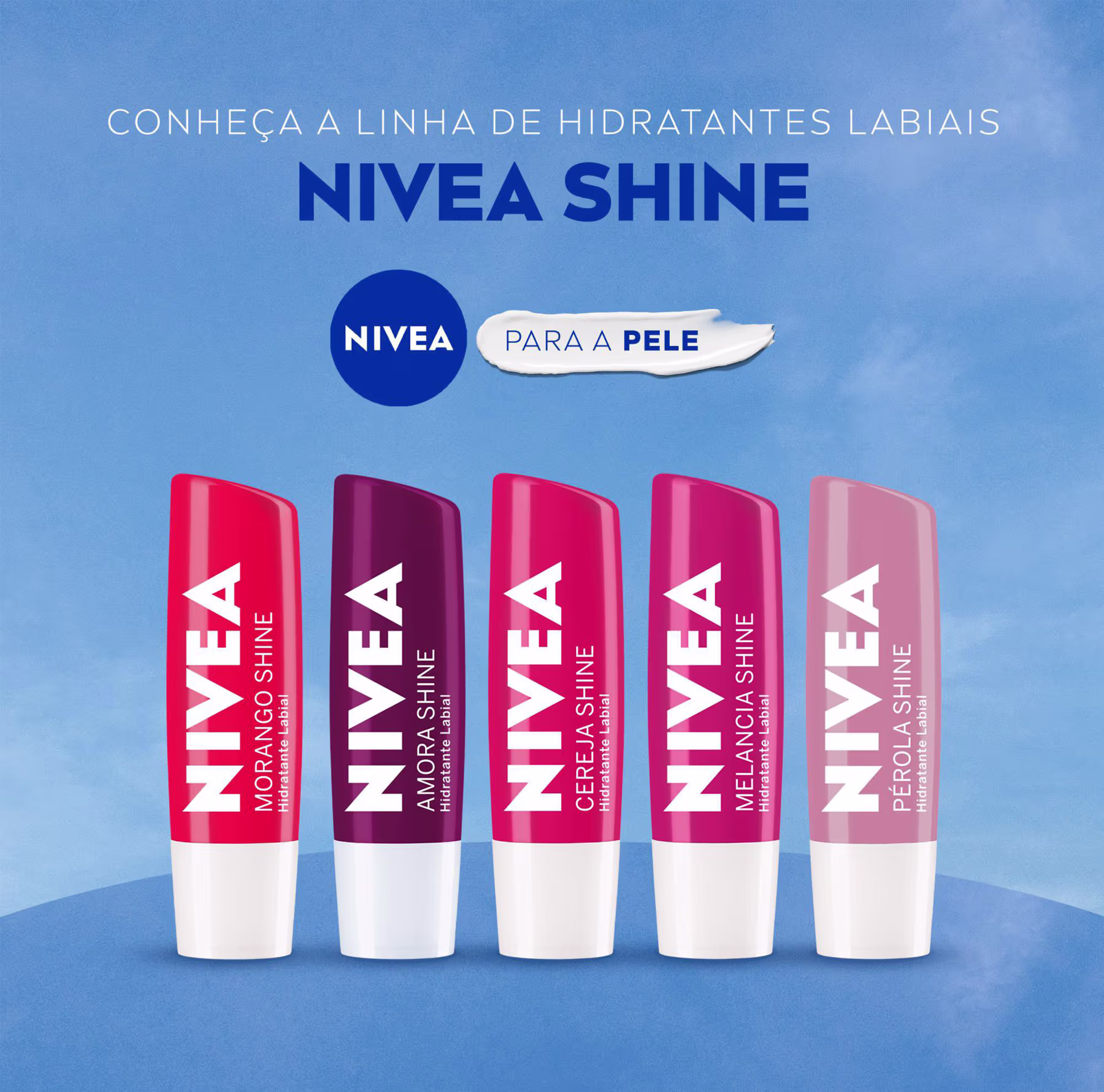 Hidratante labial. NIVEA Shine oferece cuidado e proteção por 24 horas, hidratando e proporcionando brilho delicado aos lábios.