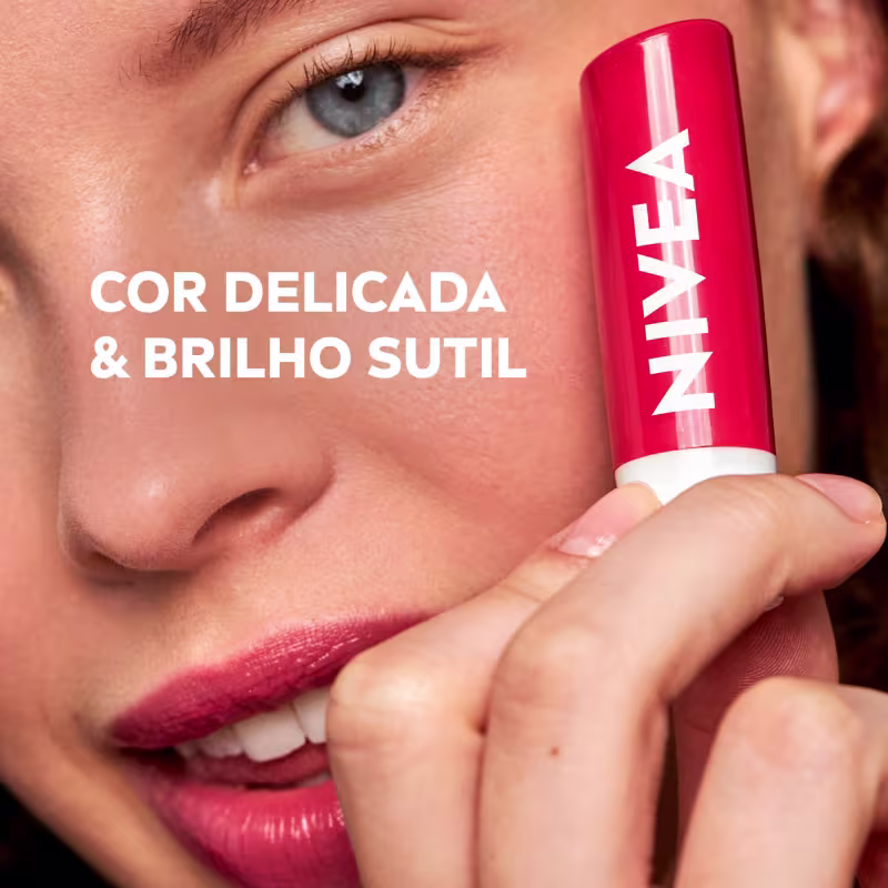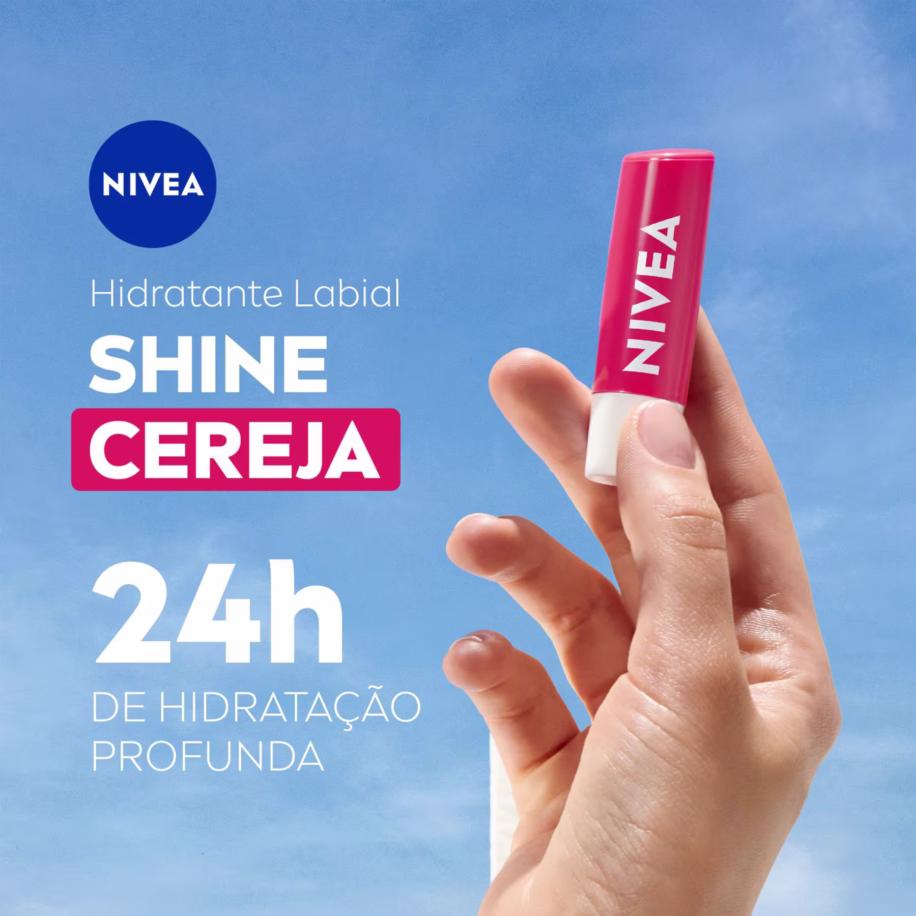 Hidratante labial. NIVEA Shine oferece cuidado e proteção por 24 horas, hidratando e proporcionando brilho delicado aos lábios.