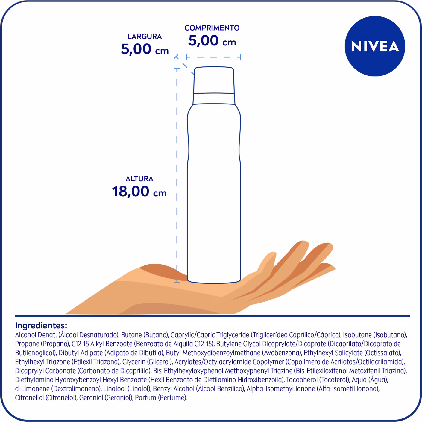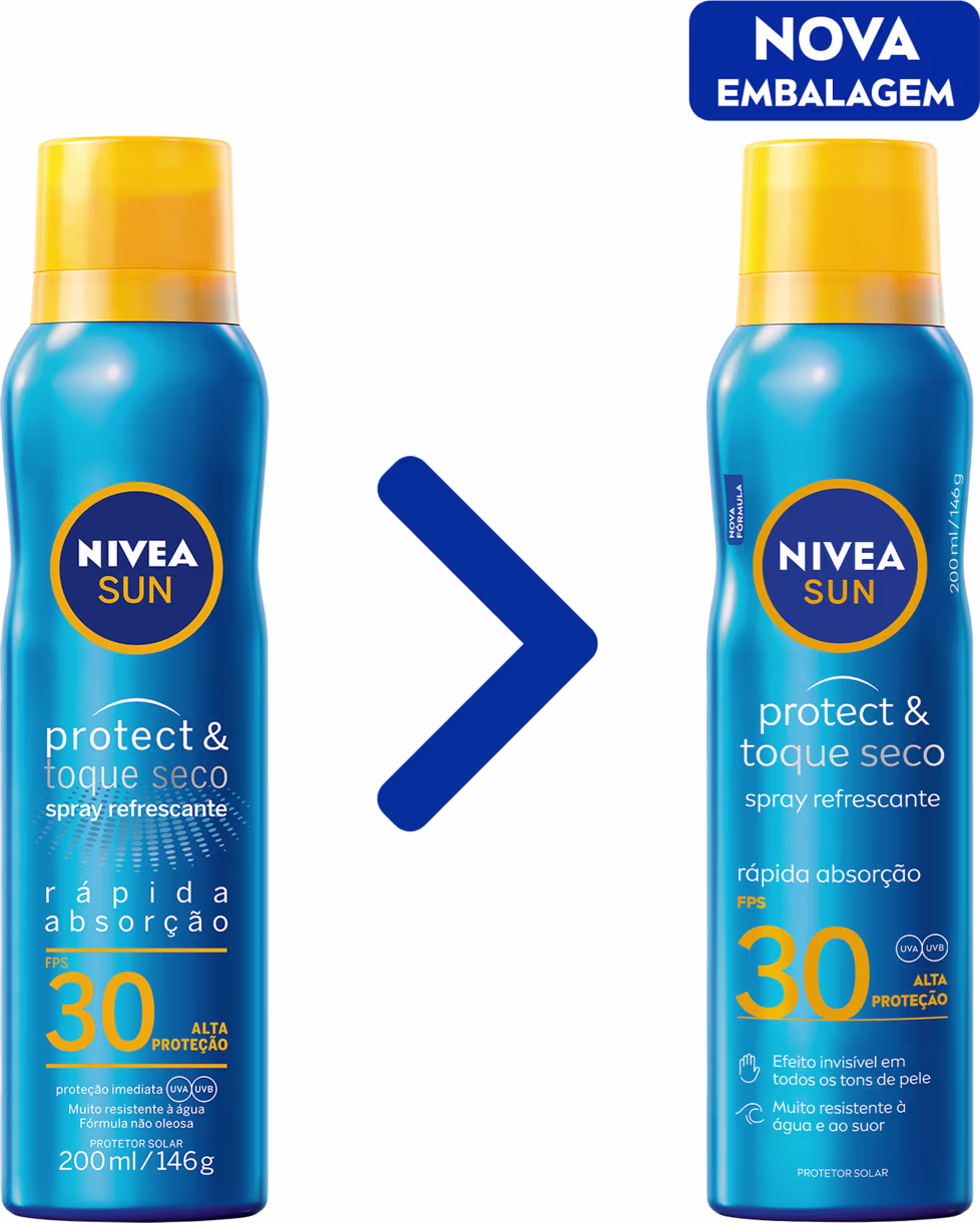 O Protetor Solar NIVEA SUN Protect & Toque Seco FPS 30 além de oferecer alta proteção contra os raios UVA/UVB e os danos causados pela exposição solar, também conta com uma fórmula oil free de rápida absorção e toque seco. Seu formato em spray facilita a aplicação, alcançando todos os ângulos e protegendo por completo por muito mais tempo, pois também é resistente à água. Sua pele fica macia, protegida e livre da sensação oleosa e das manchas esbranquiçadas.