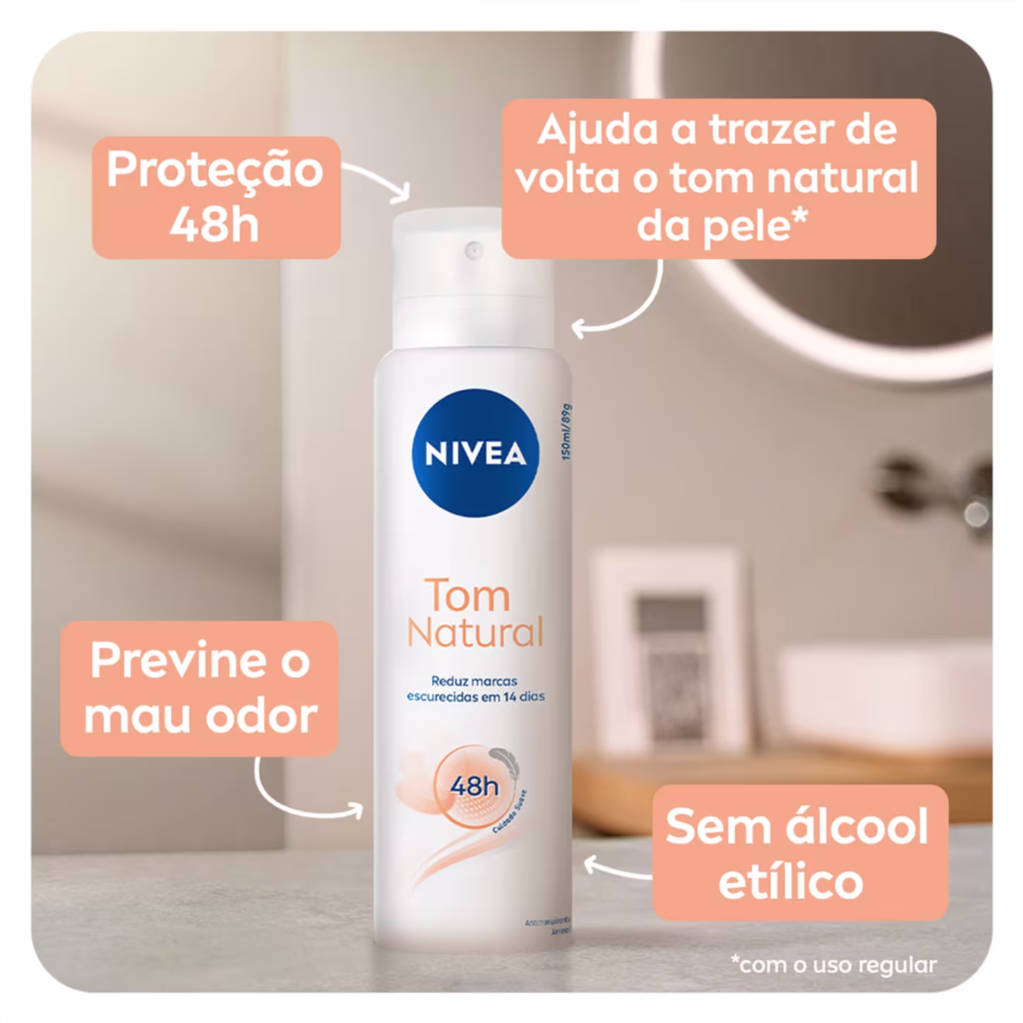 O Desodorante Antitranspirante Aerossol NIVEA Tom Natural uniformiza o tom da pele das axilas, clareando pontos escurecidos causados por lesões da depilação e protegendo a pele contra possíveis marcas. Além disso, este produto possui uma fragrância suave que adiciona um toque de frescor à sua rotina diária.