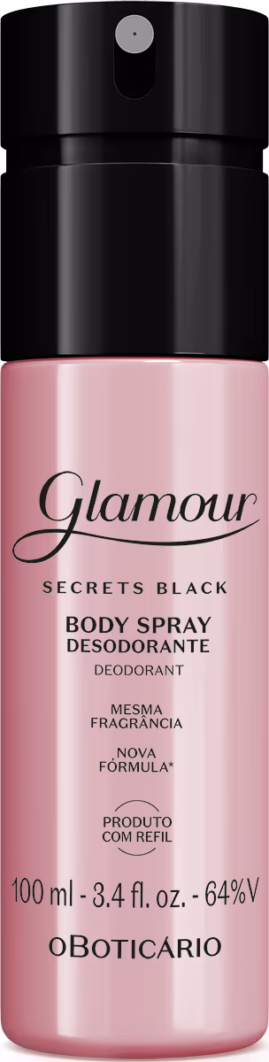 Body spray desodorante. o Boticário Glamour Secrets Black deixa a sua pele perfumada, saudável e protegida. Possui uma embalagem prática, assim você pode carregar na nécessaire ou bolsa e se cuidar o dia todo!