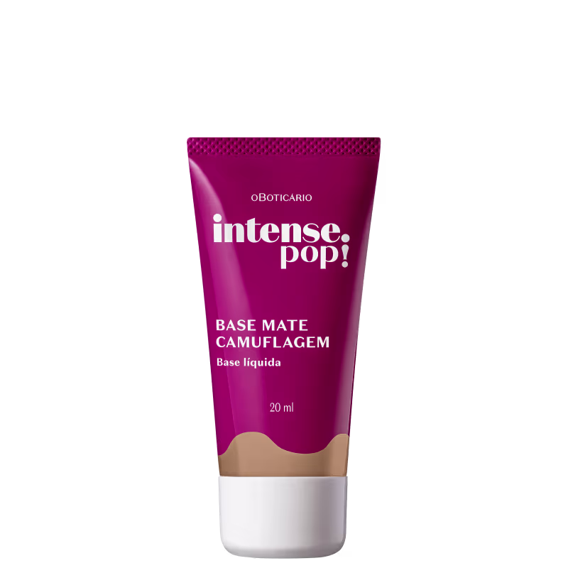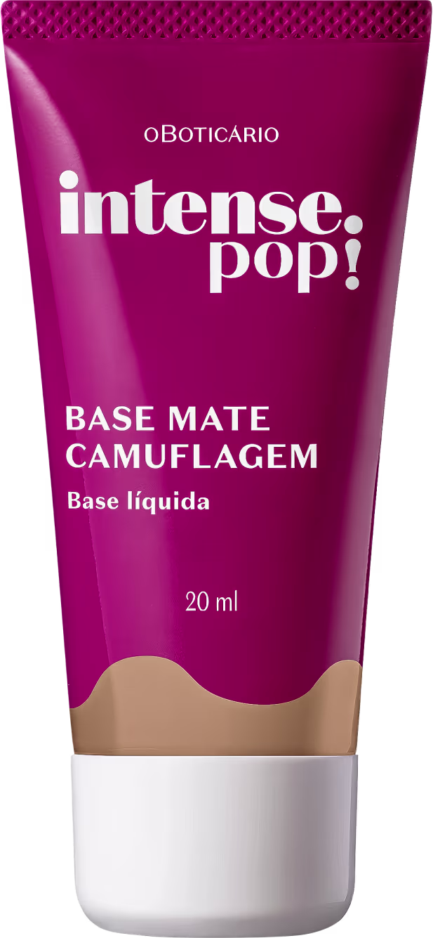 Base líquida com acabamento matte. o Boticário Intense Pop! Camuflagem possui efeito soft focus que camufla imperfeições, além de textura com toque seco.
