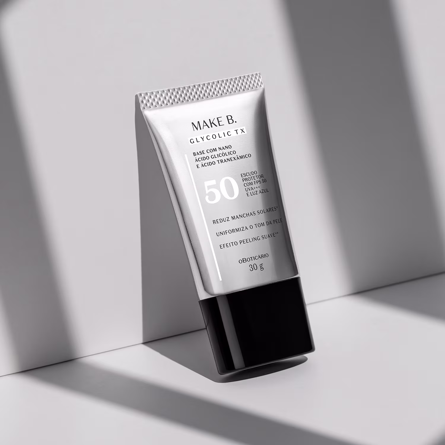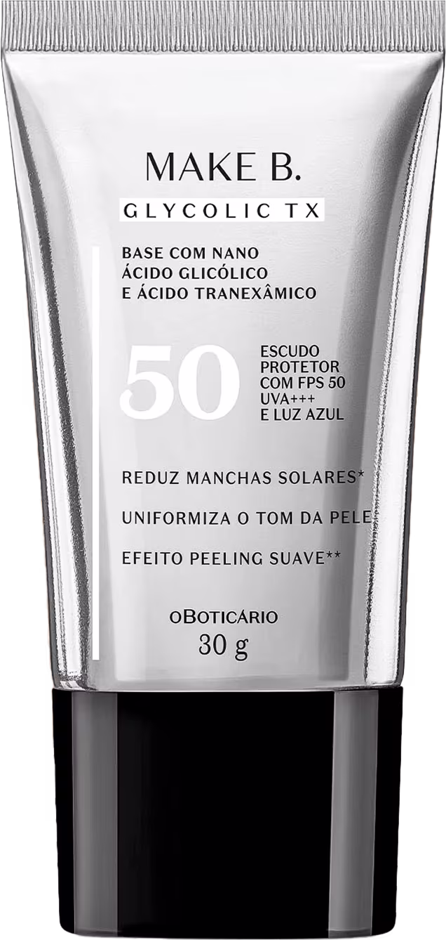 Pioneira em inovação, a Base Líquida o Boticário Make B. Glycolic TX é a primeira base do mundo que reduz manchas na pele causadas pelo sol*. Um produto com vários ativos: unindo tecnologia e tratamento para peles mistas e oleosas, combina Nano Ácido Glicólico + Ácido Tranexâmico e FPS 50 que garante proteção e cobertura para uma pele revitalizada e uniforme.
