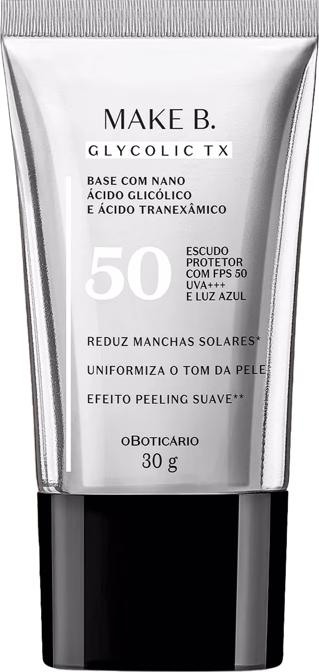 Pioneira em inovação, a Base Líquida o Boticário Make B. Glycolic TX é a primeira base do mundo que reduz manchas na pele causadas pelo sol*. Um produto com vários ativos: unindo tecnologia e tratamento para peles mistas e oleosas, combina Nano Ácido Glicólico + Ácido Tranexâmico e FPS 50 que garante proteção e cobertura para uma pele revitalizada e uniforme.