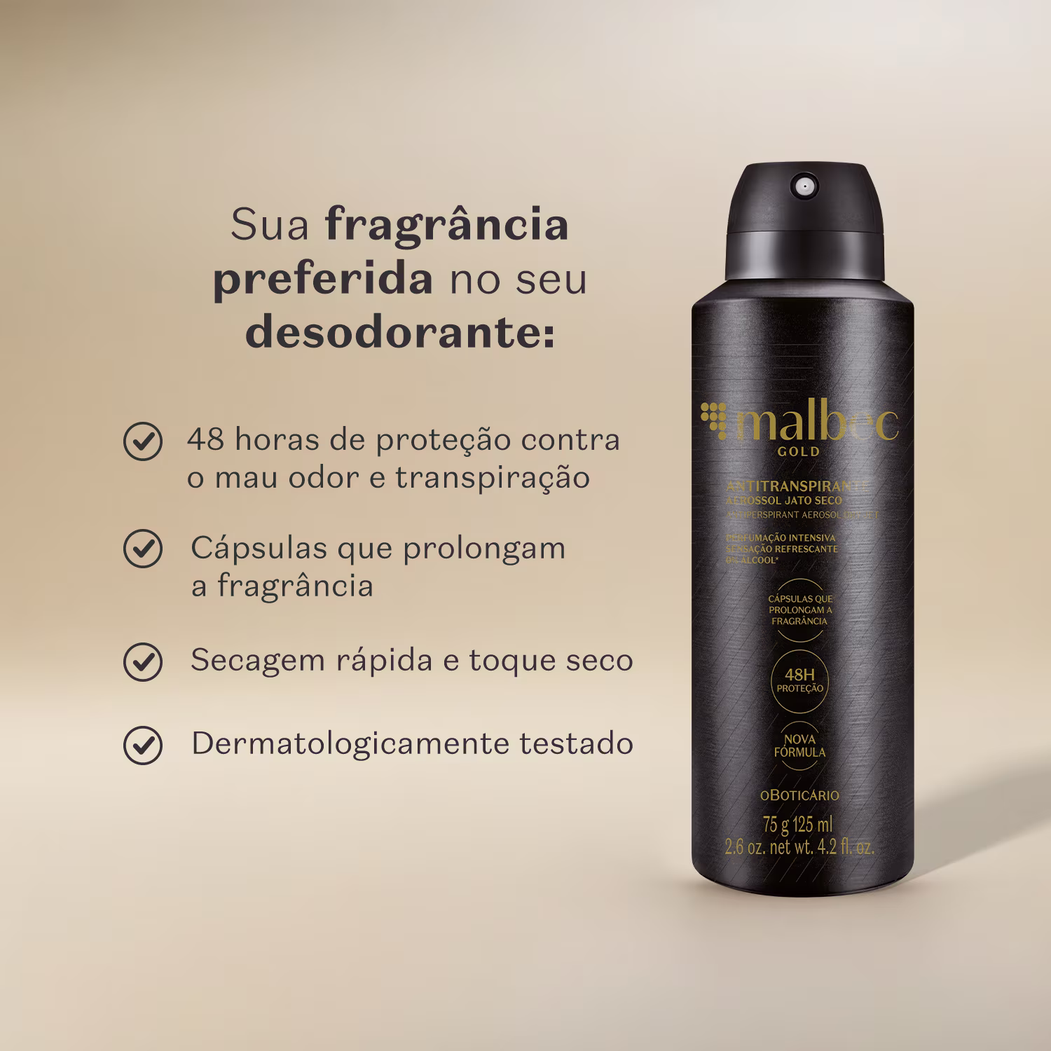 O Desodorante Antitranspirante Aerossol o Boticário Malbec Gold une a força de uma das fragrâncias mais desejadas do Boticário a uma proteção tecnológica de alto nível. Com foco no homem moderno que exige eficiência, este produto é vegano e utiliza agentes antibacterianos para eliminar as bactérias causadoras do mau odor logo na origem, garantindo segurança absoluta por até 48 horas.