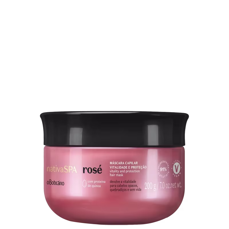 A Máscara o Boticário Nativa SPA Rosé Vitalidade e Proteção revitaliza os fios com uma nutrição profunda. Sua composição conta com um Blend de Rosas e Proteína de Quinoa, que confere luminosidade aos cabelos, além de trazer nutrição e resistência.