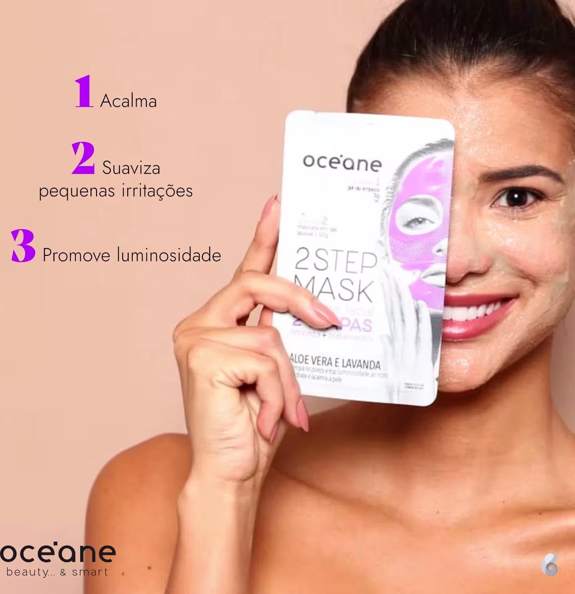 Máscara Facial 2 Step Amêndoa e Vitamina E Océane também proporciona maior firmeza ao rosto. É ótima opção para incluir em sua rotina de cuidados com a pele, porque une praticidade e eficiência em um único sachê.