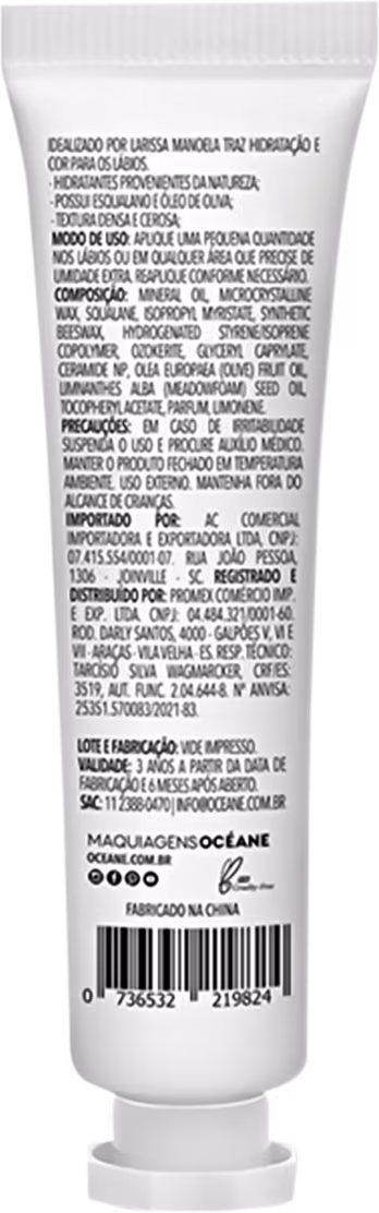 O Hidratante Labial Océane by Larissa Manoela Skin Balm possui textura densa e cerosa, deixando uma sensação de alta hidratação. Sua fórmula conta com ativos super hidratantes como Óleo de Oliva e Óleo de Esqualano. Sua embalagem em formato de bisnaga é super prática, possibilitando uma fácil aplicação com um design moderno.