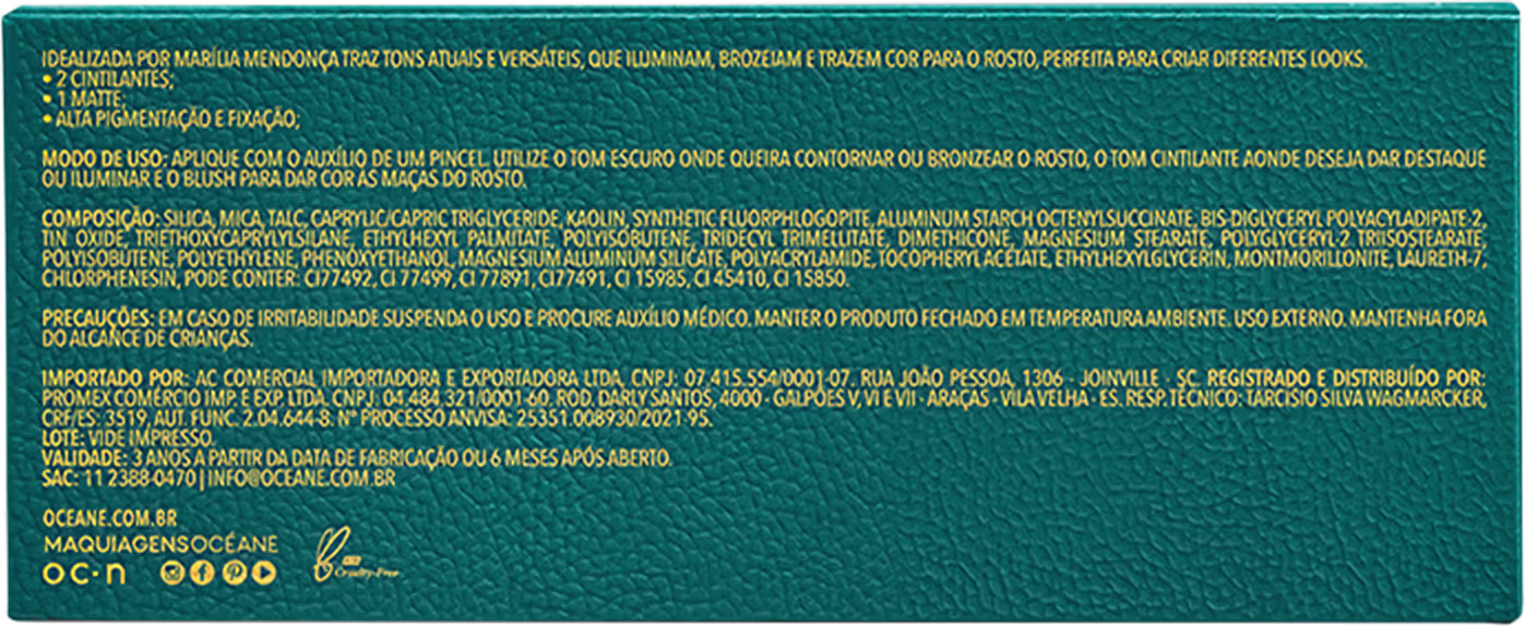 Inspirada na cantora Marília Mendonça, a Paleta Multifuncional Océane by Marília Mendonça Face Palette conta com tons para iluminar, criar efeito bronzeado, fazer contorno e dar um toque corado ao rosto. Ideal para produzir diferentes looks com make incrível para homenagear uma das artistas mais importantes da música brasileira.