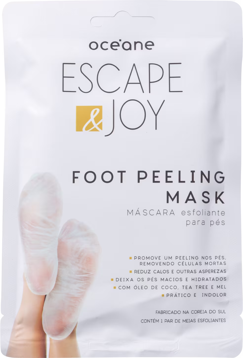 Máscara esfoliante para os pés. Océane Escape & Joy Foot Peeling Mask remove as células mortas, hidrata profundamente e suaviza a pele da região, além de minimizar calosidades e asperezas em geral.