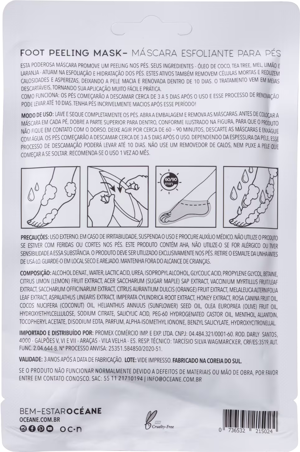 A Máscara para os Pés Océane Escape & Joy Foot Peeling Mask chegou para promover um verdadeiro efeito peeling. Com ingredientes poderosos na formulação, como Óleo de Coco, Tea Tree, Mel, Limão e Laranja, o produto promove renovação instantânea, toque sedoso e sensação imediata de conforto.