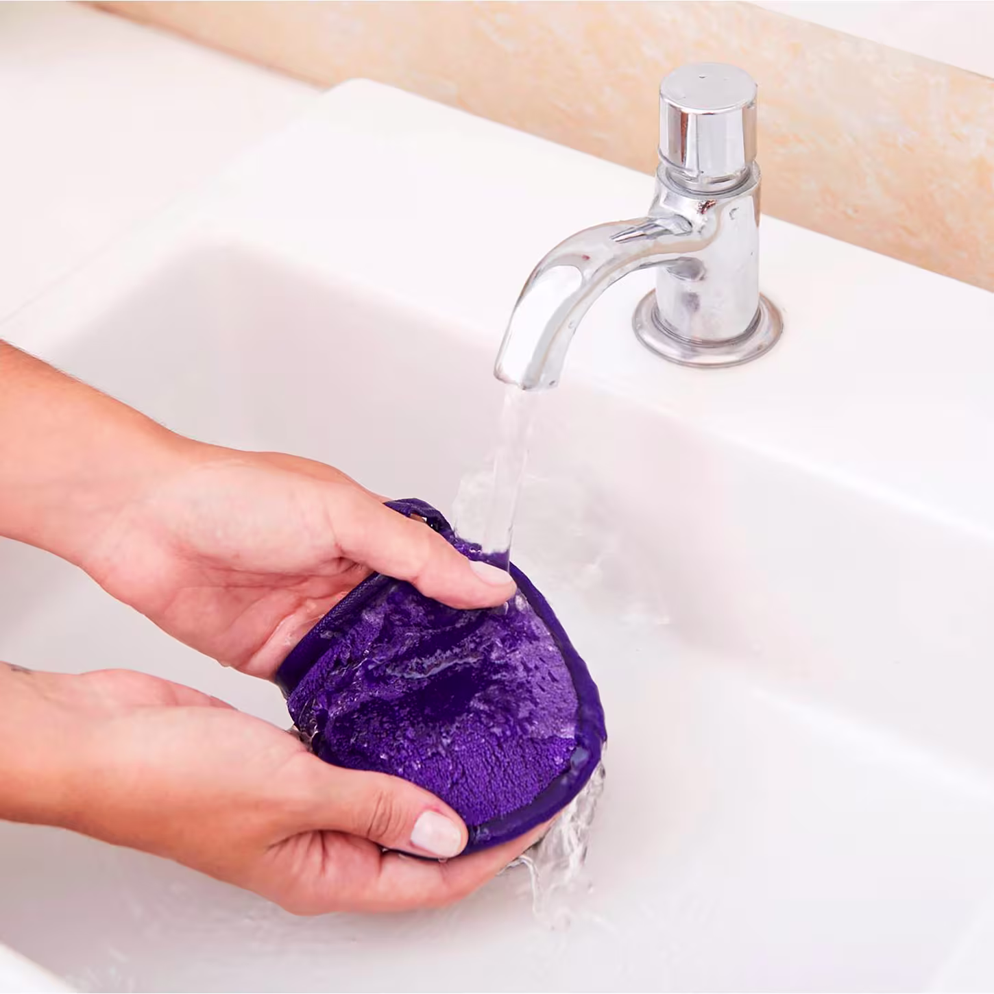 Luva demaquilante roxa para o rosto. Océane Makeout Glove remove os resíduos de maquiagem e esfolia suavemente, sem agredir a pele, inclusive as áreas mais sensíveis.
