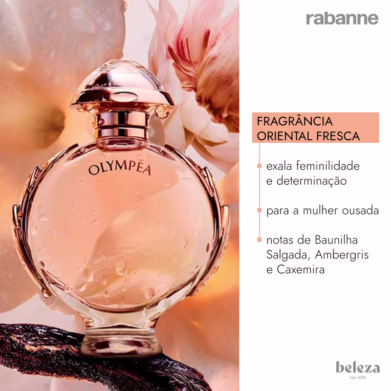 O Perfume Olympéa, de Rabanne, apresenta um aroma inesquecível, que traz à tona a feminilidade e determinação da mulher que o usa. Conta com notas de Tangerina Verde, Flor de Gengibre e Jasmim Aquático combinadas com notas de coração de Baunilha Salgada e notas de fundo de Ambergris, Caxemira e Sândalo.