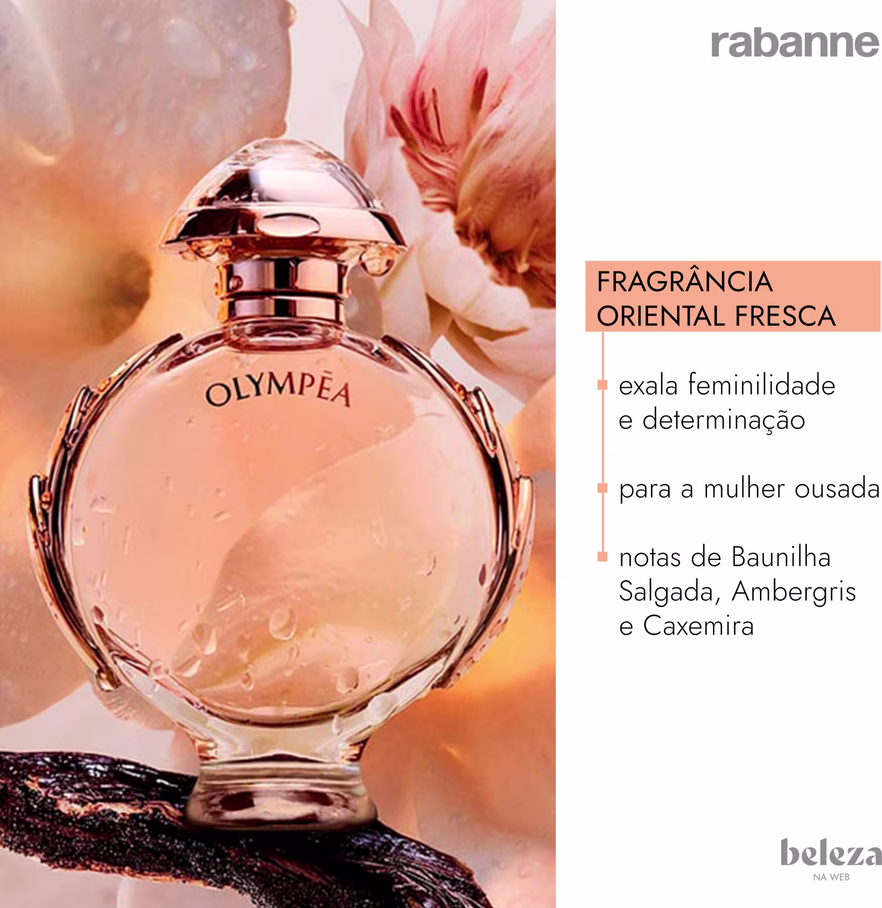 O Perfume Olympéa, de Rabanne, apresenta um aroma inesquecível, que traz à tona a feminilidade e determinação da mulher que o usa. Olympéa Perfume conta com notas de Tangerina Verde, Flor de Gengibre e Jasmim Aquático combinadas com notas de coração de Baunilha Salgada e notas de fundo de Ambergris, Caxemira e Sândalo.