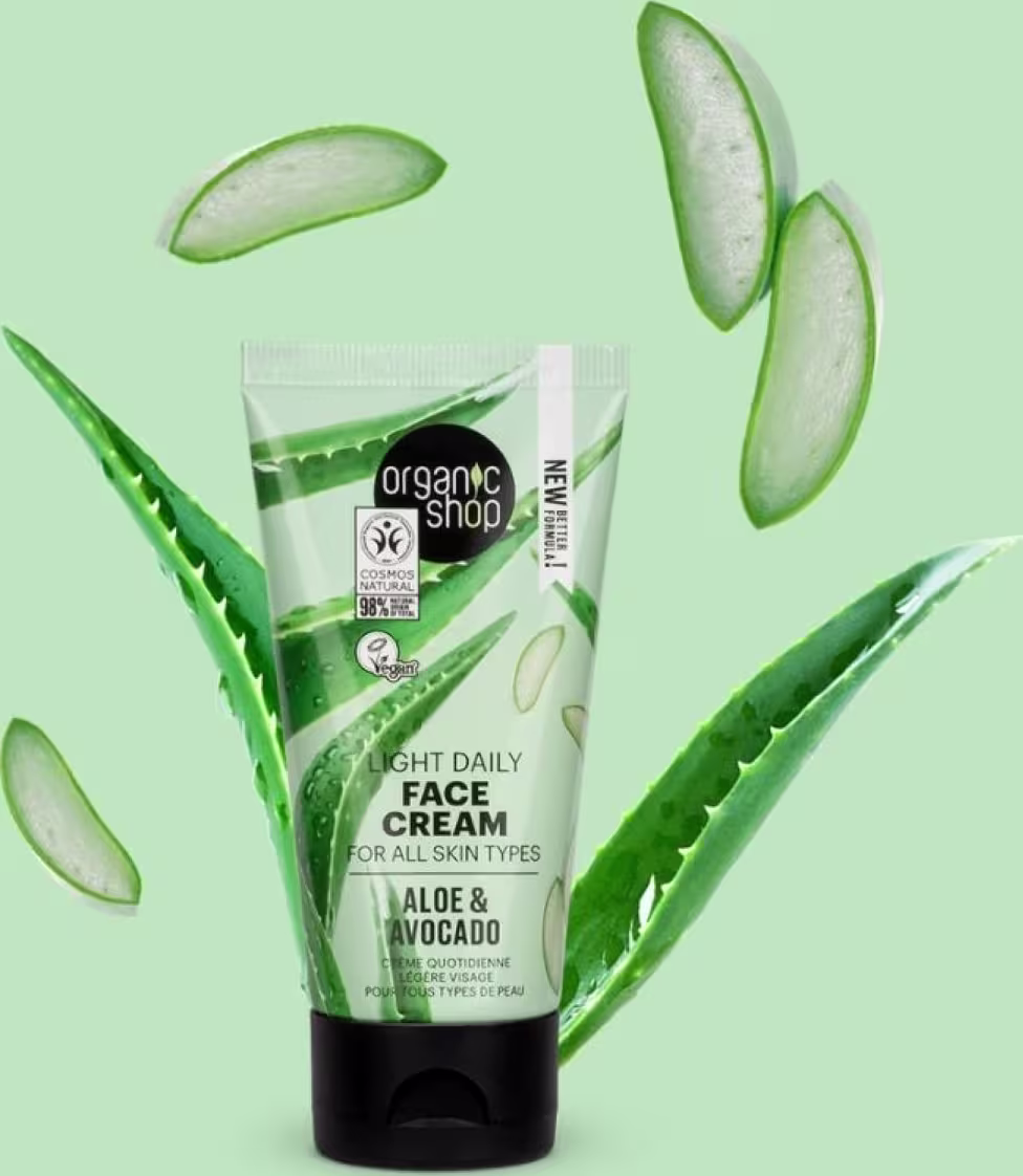 Creme hidratante facial para todos os tipos de pele. Organic Shop Aloe Vera e Abacate ajuda a hidratar e proteger, deixando a pele macia e radiante.