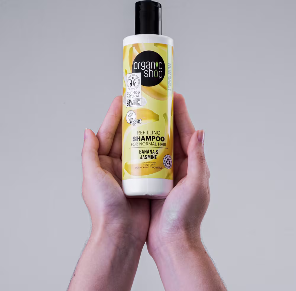 Shampoo para cabelos quebradiços. Organic Shop Banana e Jasmim oferece uma limpeza eficaz que fortalece os fios.
