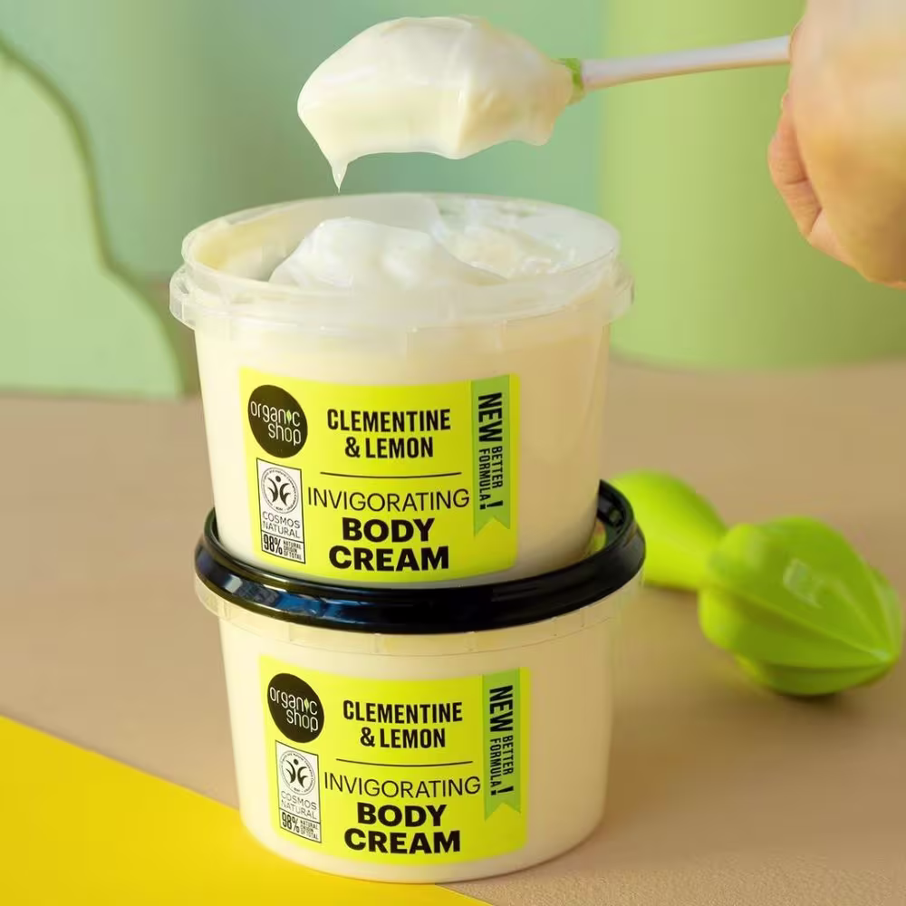 Creme hidratante corporal. Organic Shop Tangerina e Limão Siciliano nutre e hidrata intensamente a pele, conferindo um aroma cítrico revigorante.