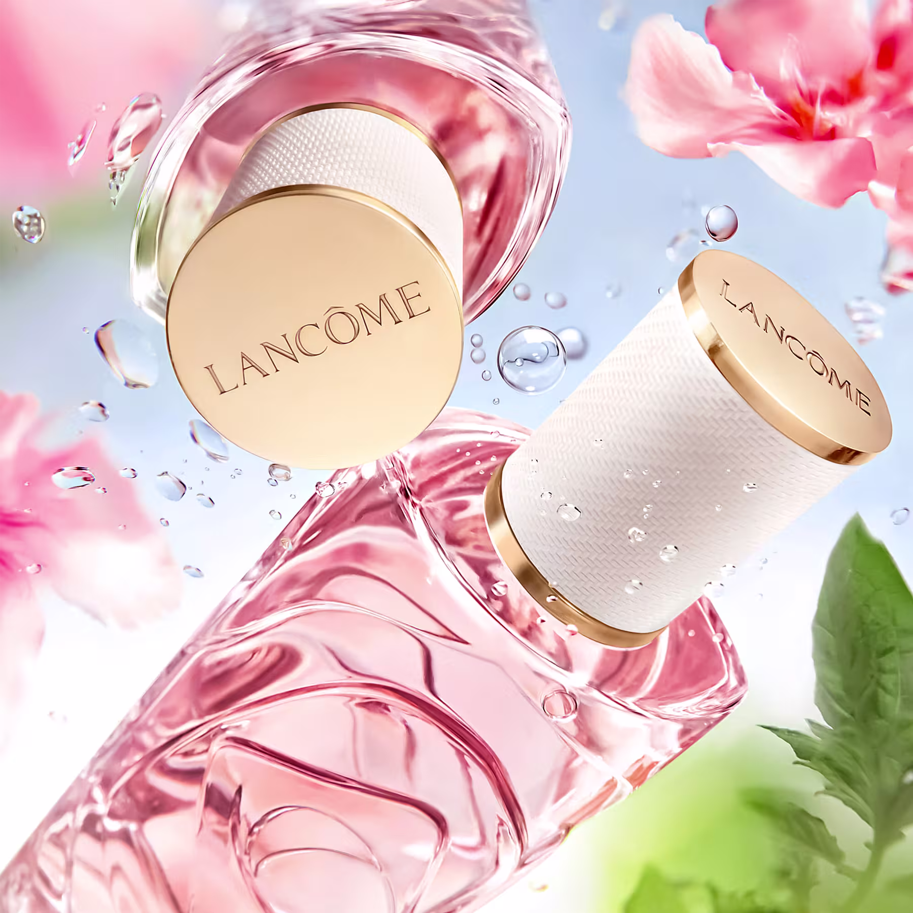 O frasco elegante, com o icônico padrão da Rosa de Lancôme gravado no vidro, não apenas preserva o perfume, mas também se destaca como um objeto de design sofisticado.
