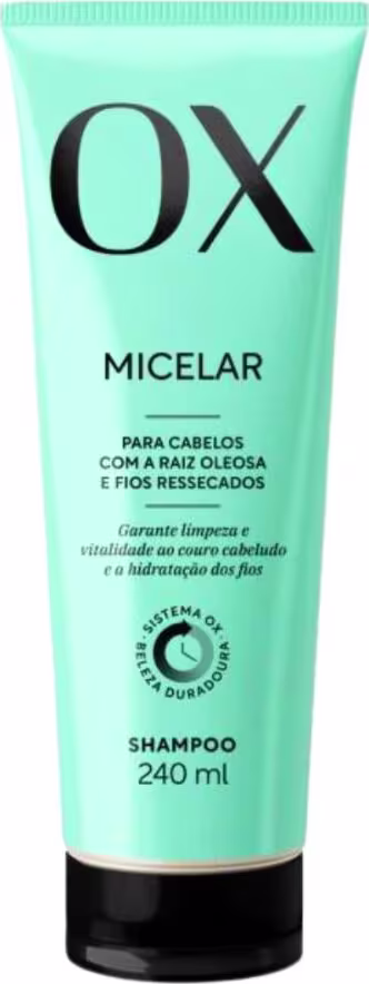 Shampoo para cabelos com raiz oleosa e pontas secas. OX Cosméticos Micelar proporciona limpeza profunda e revitaliza os fios.