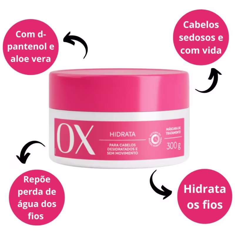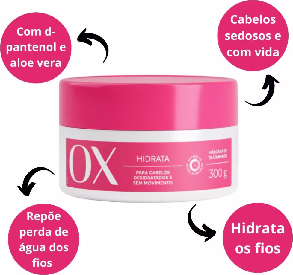 A Máscara Capilar OX Cosméticos OX Hidrata traz fórmula poderosa que repõe a hidratação perdida nos fios, entregando resultado de cabelos sedosos e hidratados por muito mais tempo.