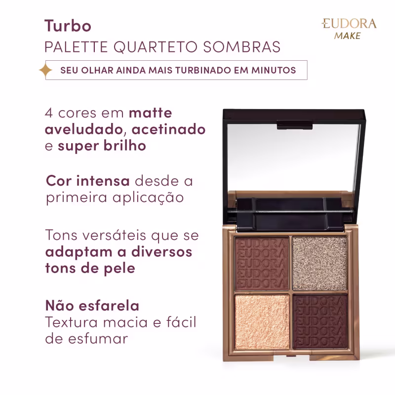 A Paleta de Sombras Quarteto Turbo Eudora Make chega em sua nova versão com fórmulas livres de talco e cores coringas pensadas para o dia e para a noite, entregando praticidade e sofisticação para o seu nécessaire.