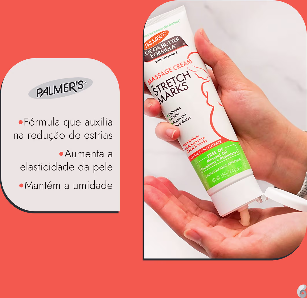 Usar o creme de forma contínua ajuda a acabar com um dos maiores dramas da gestação: as estrias. O uso diário de Palmer's Cocoa Butter Formula Massage Cream For Stretch Marks aumenta a elasticidade da pele. Emoliente, ele ajuda a manter a umidade nas regiões com mais tendência às estrias, como barriga, quadris, coxas e bustos.