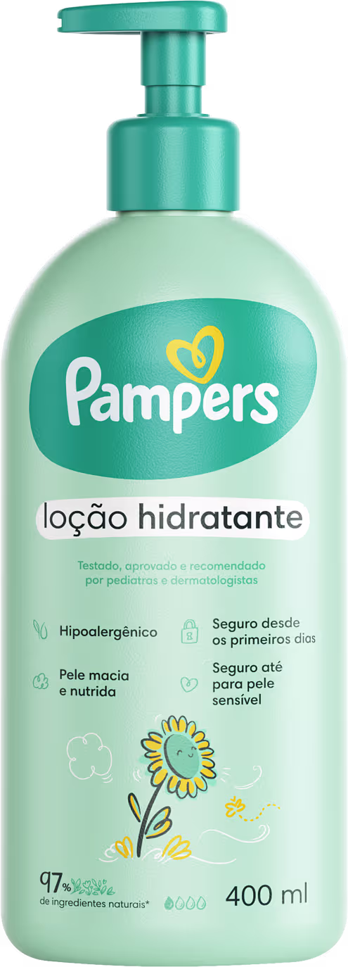 Loção hidratante infantil para todos os tipos de pele, inclusive sensíveis. Pampers Girassol traz pH ideal para a pele do bebê, textura fluida e perfumação suave, segura para recém-nascidos.