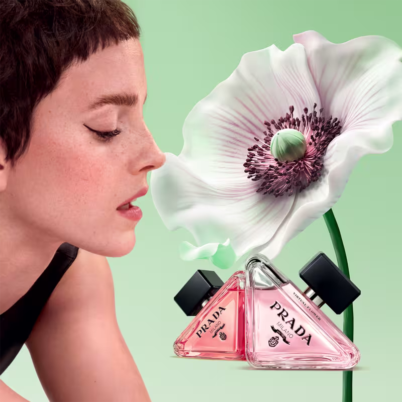 O Perfume Paradoxe Virtual Flower, da Prada, foi desenvolvido com o auxílio da Inteligência Artificial, a fragrância apresenta o acorde exclusivo de Jasmim IA, criado para reproduzir com precisão a sensação do jasmim desabrochando na natureza. O resultado é uma assinatura olfativa inovadora e envolvente, que traduz o frescor de uma flor real através de uma construção virtual. Nas notas de topo, a essência de bergamota italiana traz uma energia cintilante e moderna. No coração, o Jasmim IA e o neroli revelam uma floralidade luminosa e futurista. Nas notas de fundo, o almíscar e a ambreta criam um véu confortável, suave e elegante, como uma segunda pele. O frasco reflete o símbolo mais icônico da Prada: o triângulo. Inclinado e imponente, o design disruptivo combina o tom rosa-claro da fragrância com o preto do brasão da marca, expressando o equilíbrio entre feminilidade e modernidade. No topo, o nome “Virtual Flower” gravado no chanfrado superior reforça a estética contemporânea e tecnológica que define esta criação.