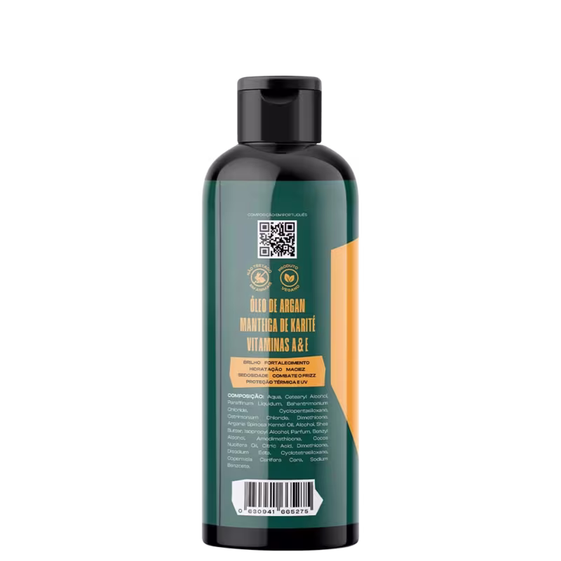 Enriquecido com ingredientes premium, como Óleo de Argan, Manteiga de Karité, Vitamina A e Vitamina E, esta fórmula vegana promove brilho, fortalecimento, hidratação intensa e proteção térmica e UV.
