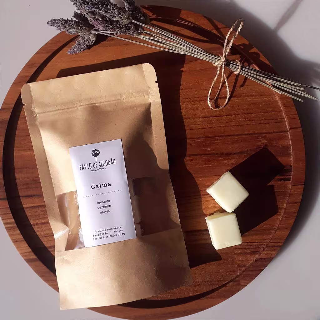 Pastilhas aromáticas. Pavio de Algodão Calma são feitas com um blend de ceras vegetais e óleos essenciais para perfumar e transformar o ambiente.
