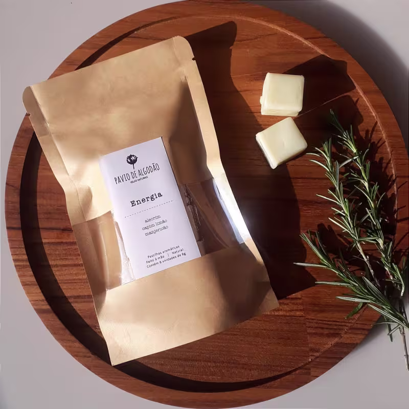 Pastilhas aromáticas. Pavio de Algodão Energia são feitas com um blend de ceras vegetais e óleos essenciais para perfumar e transformar o ambiente.