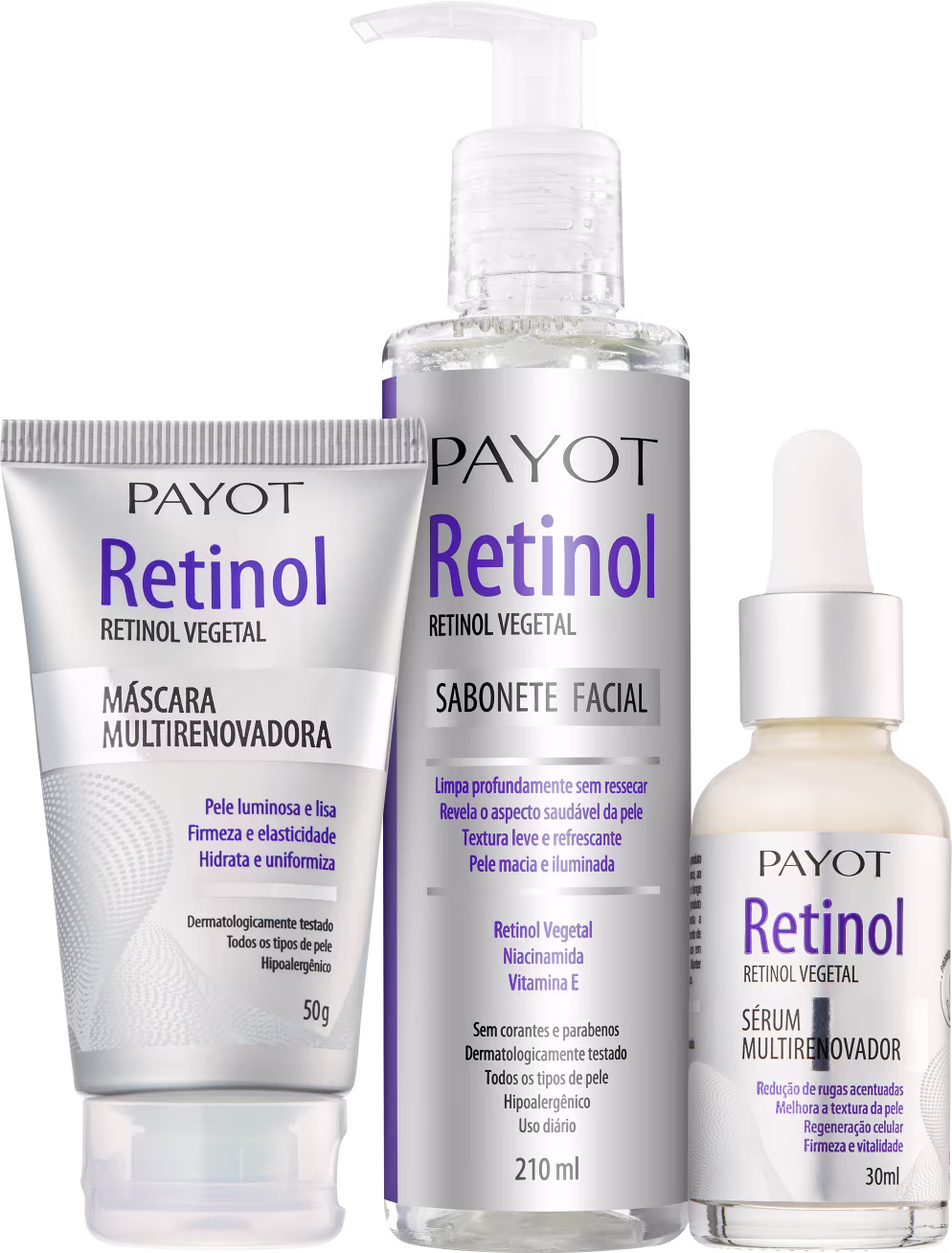 Kit com sabonete, sérum e máscara para cuidados faciais. Payot Retinol garante uma pele uniforme, firme e com vitalidade.