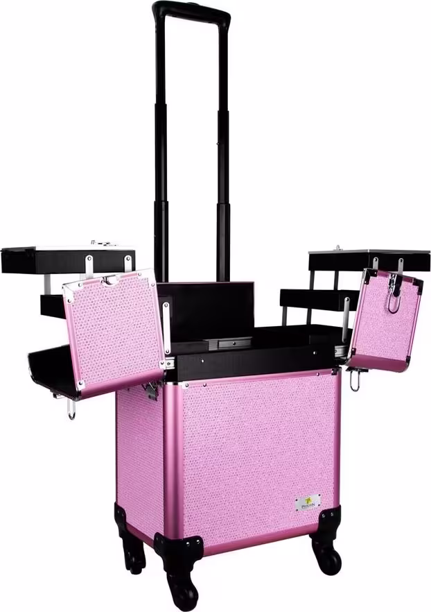 A Maleta de Maquiagem Pelegrin 3 em 1 PEL-M1022 Rosa Cristal foi desenvolvida pensando em segurança no transporte e armazenamento de todo os seus bens. Acompanha chaves e é fabricada em estrutura de alumínio resistente com cantos de aço reforçado, MDF e ABS. Visando a praticidade na locomoção, é equipada com alça de mão e também alça extensível retrátil telescópica para auxiliar no transporte, além de contar com diversos compartimentos e divisórias que facilitam a organização dos materiais por tamanho e utilidade.