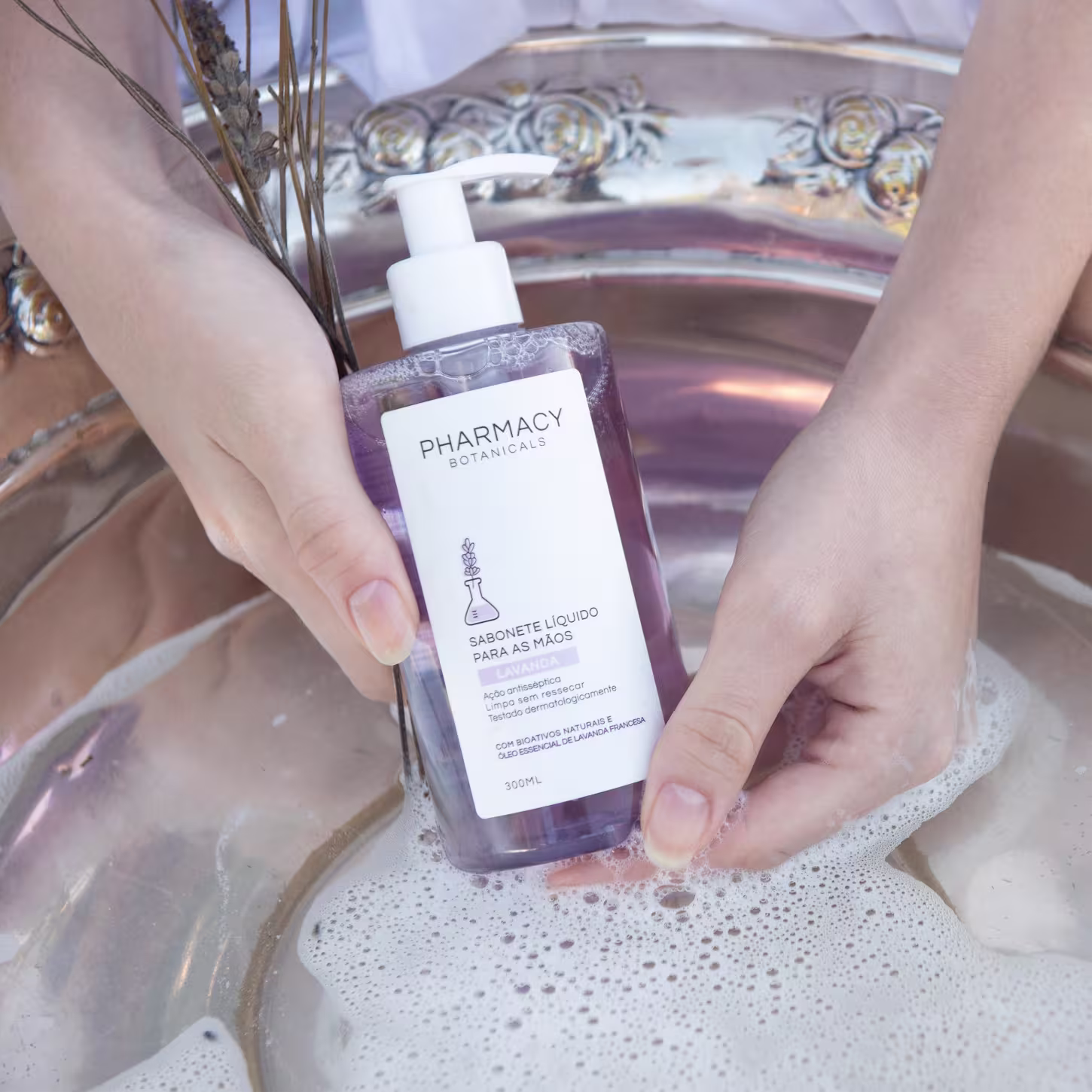 Sabonete líquido para as mãos. Pharmacy Botanicals Lavanda limpa sem ressecar e tem ação antisséptica para fortalecer a proteção após a higienização diária.