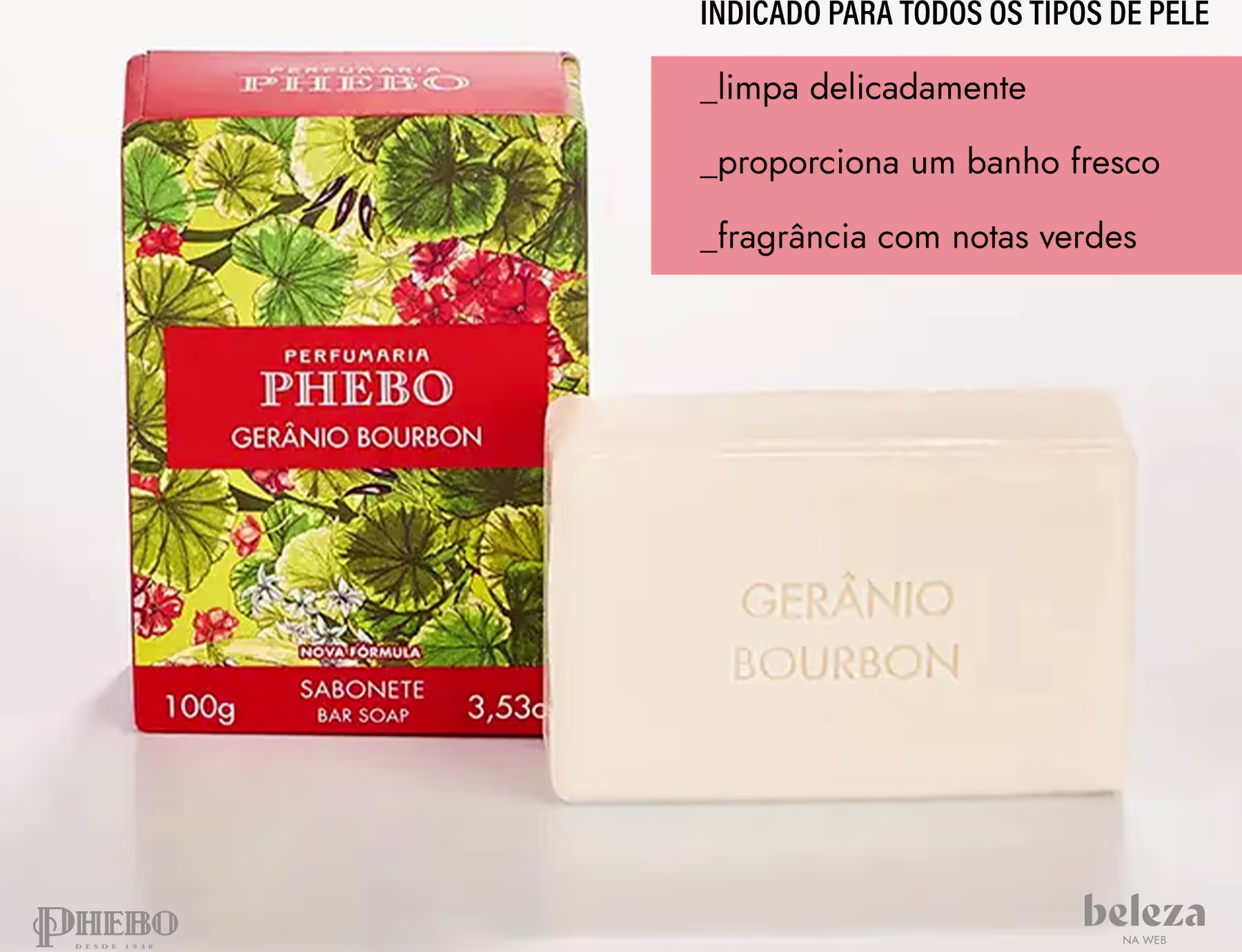 Sabonete Phebo Mediterrâneo Gerânio Bourbon em Barra, com fragrância de notas verdes. Melhores Sabonetes Phebo na BLZ Ver mais ❯