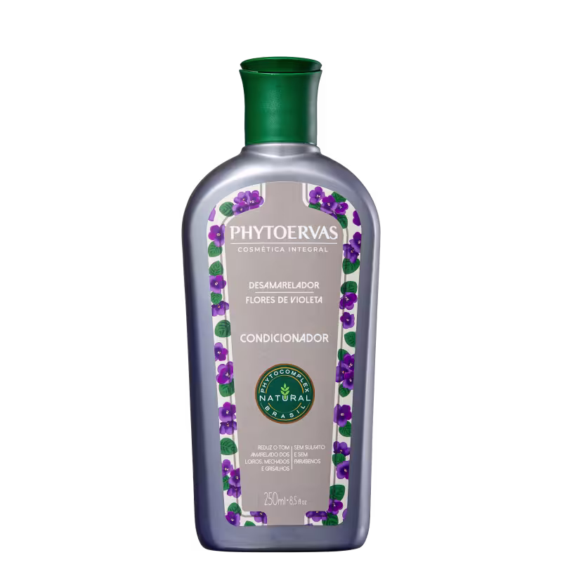 Condicionador para cabelos loiros ou grisalhos. Phytoervas Desamarelador Flores de Violeta entrega maciez, desembaraço e matização gradativa do tom amarelado nos fios.